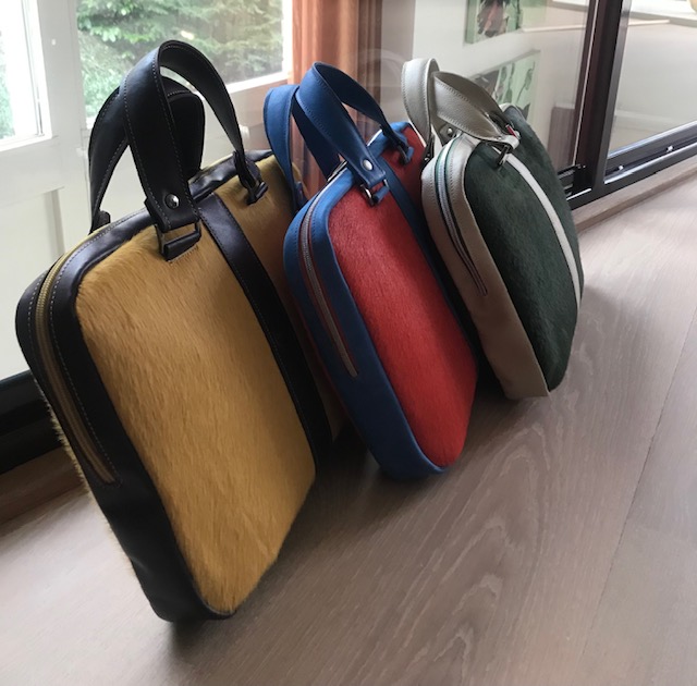 | Kleurstelling | In principe kan de tas van elke kleur leer gemaakt worden. Hier zijn voorbeelden in de combinaties oranje/blauw; groen/beige en okergeel met een donker paars |